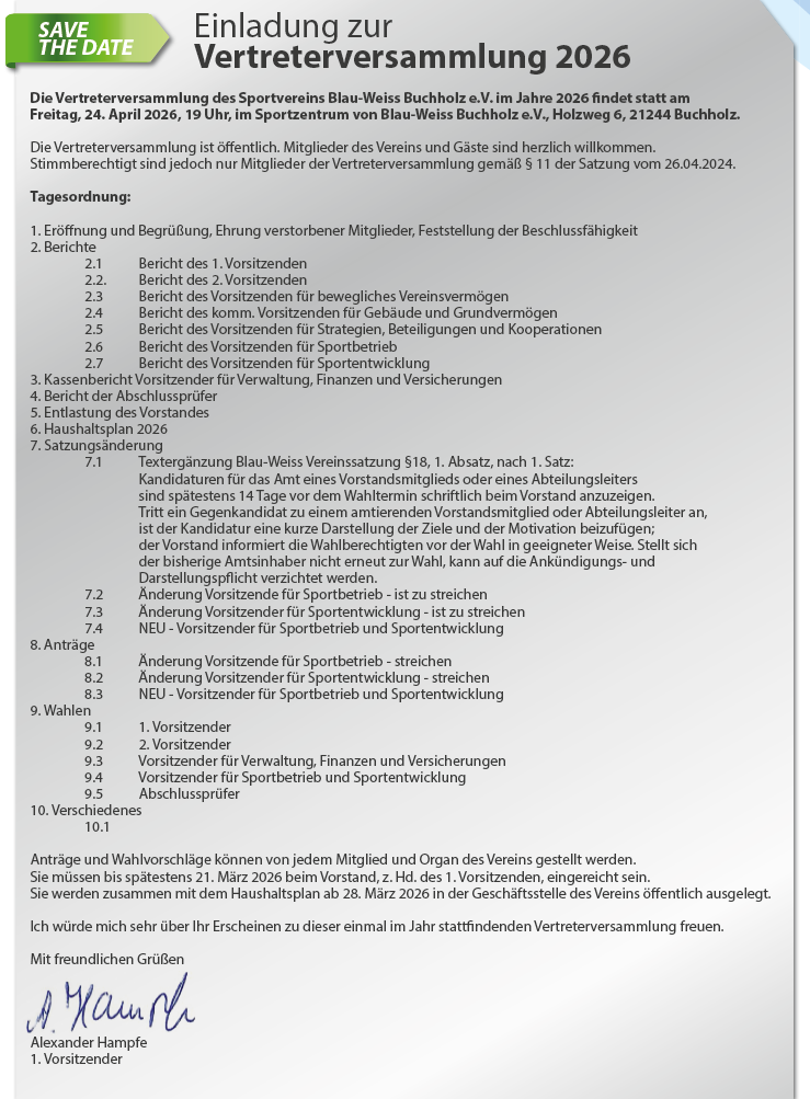 Am 24. April 2026 findet die diesjährige Vertreterversammlung von BLAU-WEISS Buchholz e.V. im Sportzentrum Süd im Holzweg 6 statt.